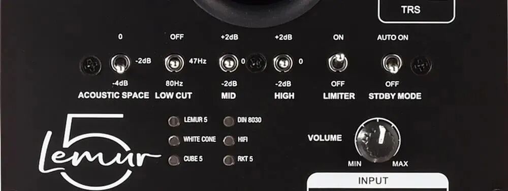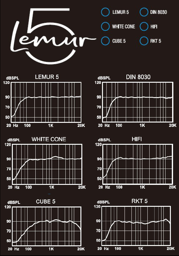 我们通俗的说 Lemur 5 的原理其实就是在一个扬声器中模拟不同 "设备" 的音频频繁响应。除了 Lemur 5 自己以外, 我们根据名称的理解,大致为 White Cone (Yamaha)、DIN 8030 (Genelec)、RKT 5 (Rokit 5)、Cube 5 (Avantone Mixcube) 和 HIFI(通常类似于家用家庭 HIFI 系统),以上模拟设备名称和厂牌仅供参考