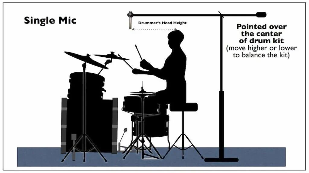 把麦克风放在鼓上方,高度保持与鼓手的头顶平齐(向下)。