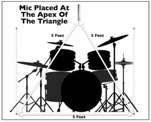 可视化一个等边三角形,三角形的底边是鼓组的总宽度;然后将麦克风(从心形指向开始,但不要害怕尝试其他指向)放在三角形的顶点,直接放在鼓组中心的上方。
