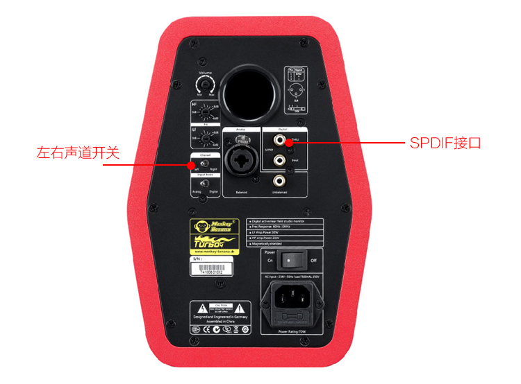 Turbo系列的监听音箱有4寸、5寸、6寸和8寸的型号可供选择,能够符合各种的工作需求。音箱箱体的设计非常的圆滑,而且还有黑色、红色和黄色这三种可选择的颜色。不过,这个Turbo系列最吸引我们的是,除了配备了标准的Neutrick接口外,它还拥有SPDIF接口。有了SPDIF接口,我们将这款监听音箱连接到一个音频接口上来接收最纯粹的数字信号。Monkey Banana公司甚至独具匠心地为音箱添加 了一个开关,以便在使用数字模式的时候分配音箱的左右声道。