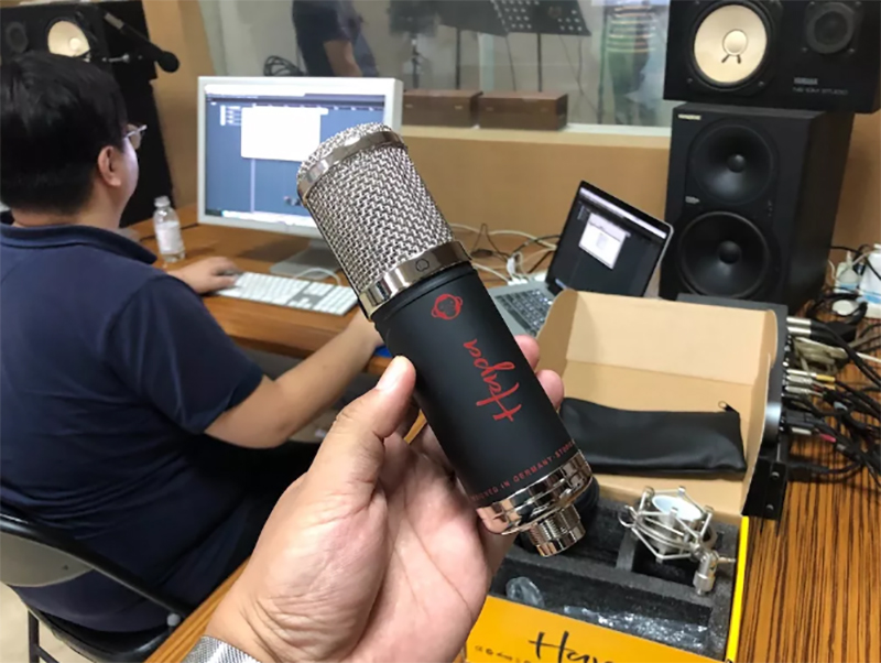 图3:录音棚中开箱。话筒很有质感,使用了大面积的镀铬亮面。外壳上印着猴子Logo和Hapa的字样。
