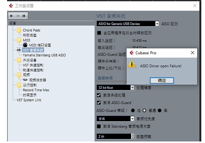 图16:在Cubase中,能够认出这个话筒的ASIO驱动,但是,选择的时候却显示打开失败。无法使用。这应该是Win自带驱动的问题。但包装中没有附带驱动,说明书中也没有提供驱动下载地址。不过一般来说这款话筒的用户大都并不使用Cubase来录音,因为这只话筒本身只有输入,没有输出口。所以ASIO并无意义。