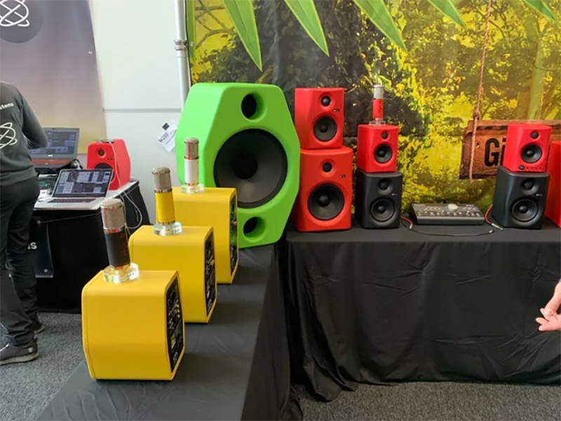 图21:在Superbooth2019展会上,颜色靓丽的香蕉猴话筒和音箱惊艳全场。图中我们可以看到除了黑色版本,Hapa还有黄、白、红三种版本。